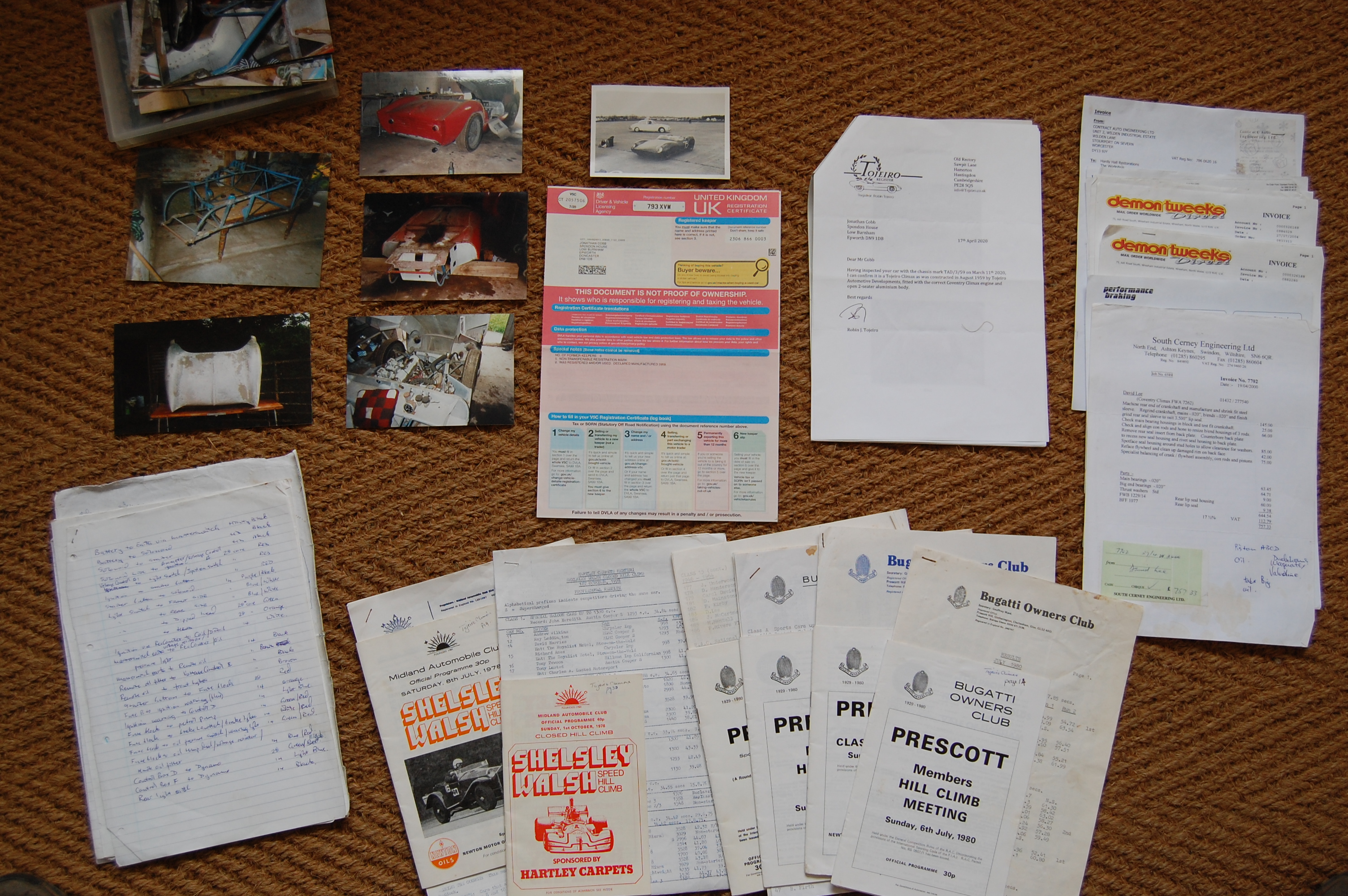 By 1978 Lee had restored the car, fitted a competition 1100cc Climax engine and started competing in historic classes at various hillclimbs around the country. There are various programmes, photos and results sheets from Davids’s days hillclimbing the car. David retained ownership of the car for almost 50 years until his death after which the vendor purchased it from his Widow.